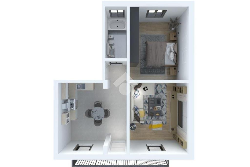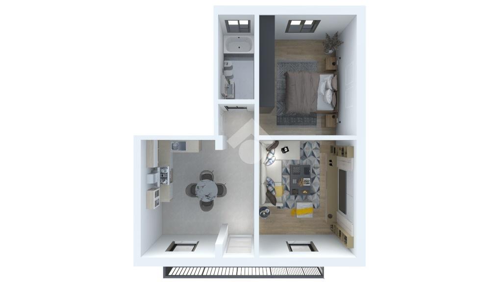 L'appartamento è composto da tre locali: due camere da letto, un bagno e un soggiorno che si affaccia su un balcone.