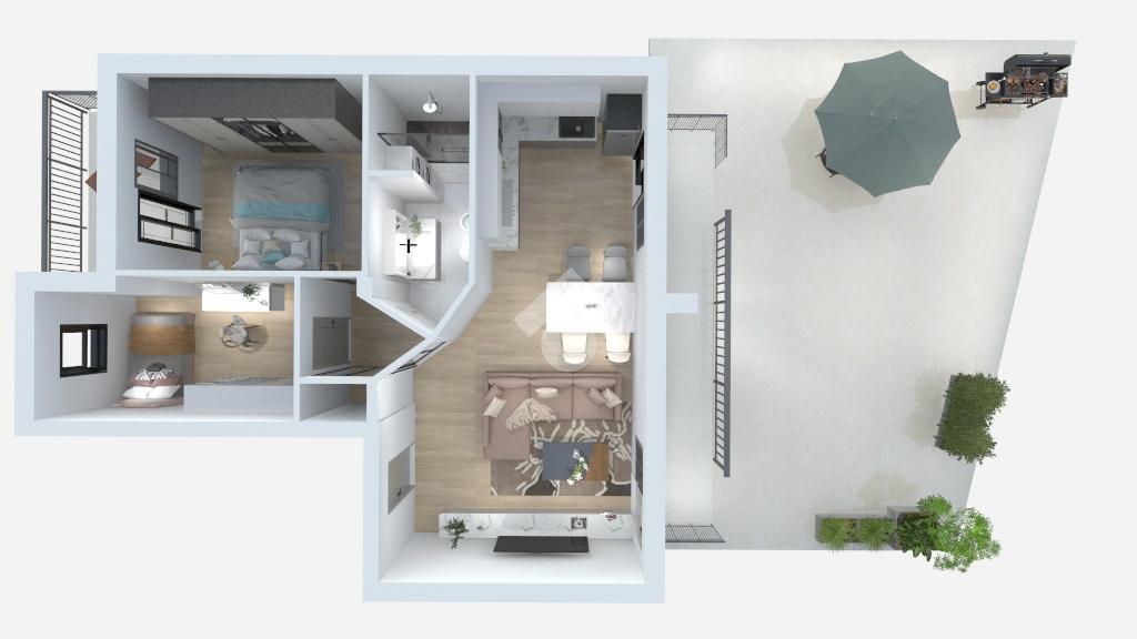L'immobile, completamente ristrutturato nel 2016, offre un ambiente moderno e funzionale. La zona giorno si apre su un ampio soggiorno con accesso diretto al terrazzo, ideale per momenti di relax all'aperto. La cucina è un angolo cottura ben organizzata. Vi sono due camere da letto luminose, mentre il bagno è dotato di un impianto di areazione VLC di ultima generazione.